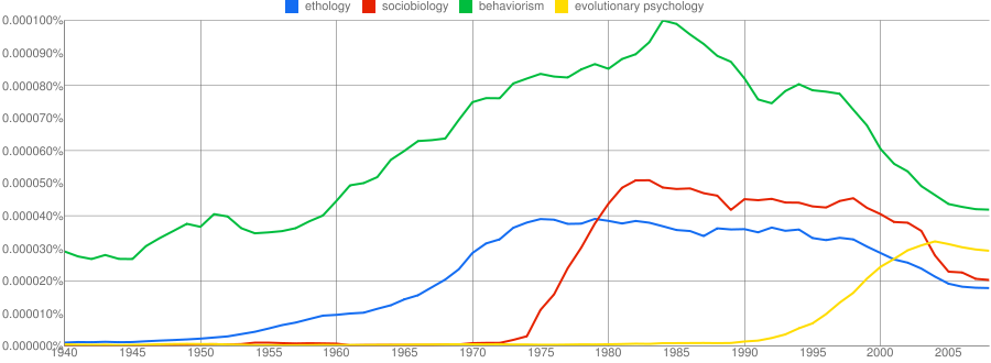 Google är väldigt bra på att samla in data; de har sökt igenom en stor mängd texter och gjort databaser av förekomsten av olika n-gram, alltså olika kombinationer av två ord, tre ord, fyra ord och så vidare. Fast roligast att leka med är kanske 1-gram, alltså enstaka ord. Google har också gjort ett verktyg som ritar diagram åt oss. Låt oss titta på deras samling engelskspråkiga böcker. Det finns massor av skojiga sökningar på nätet, men jag tänkte på den här: