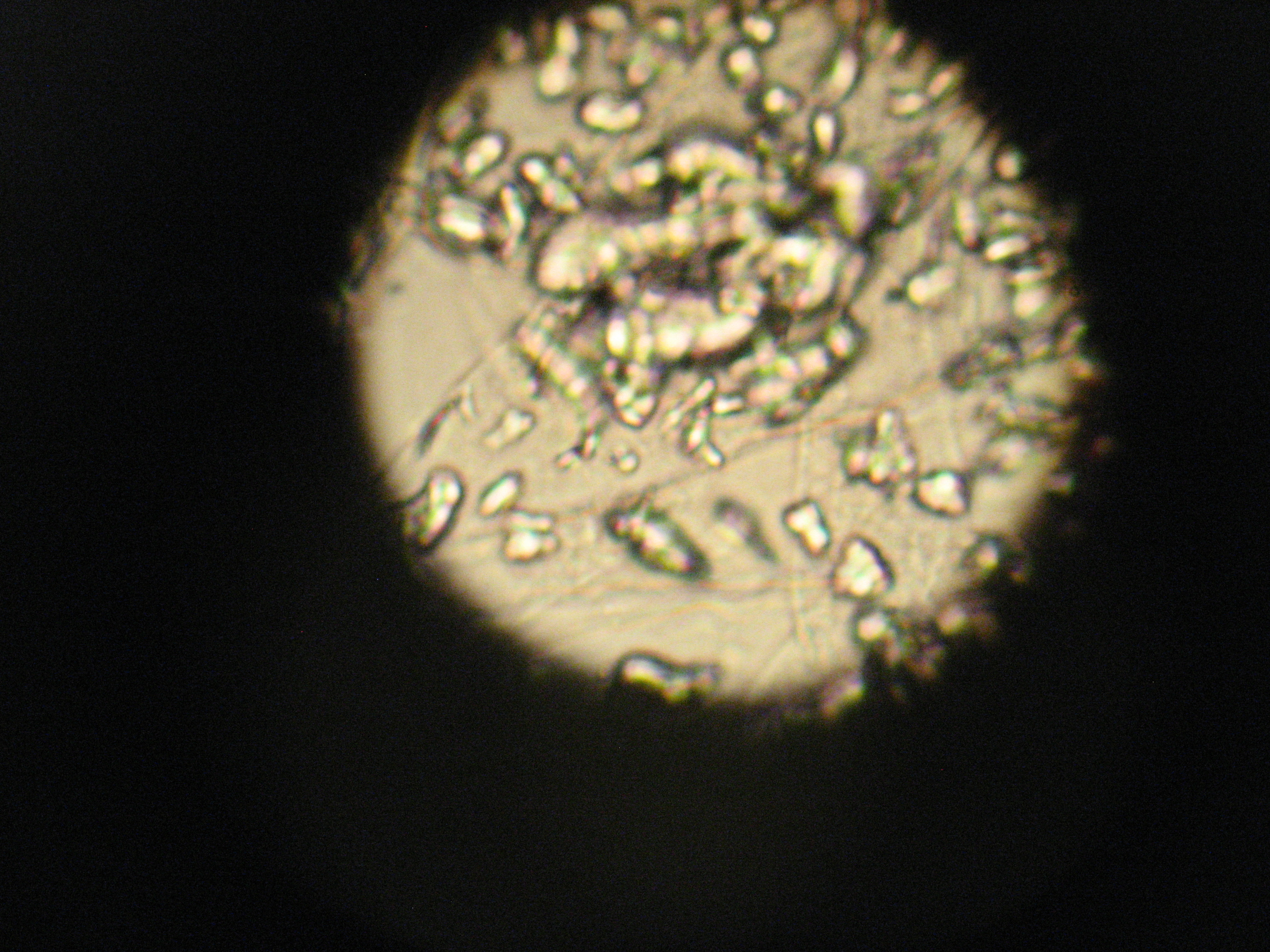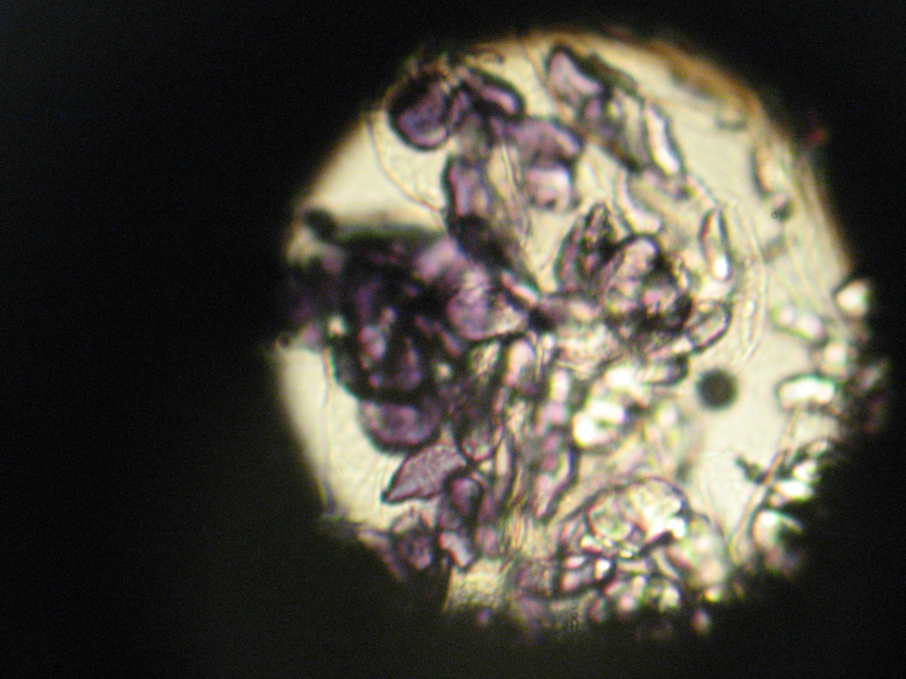 Blad av Elodea (vattenpest). Nedan två (mycket fula) preparat av bananer med och utan Lugols jodlösning. Om någon cellbiologistudent läser detta, tag lärdom. Vi kan få betydligt snyggare bilder än såhär: