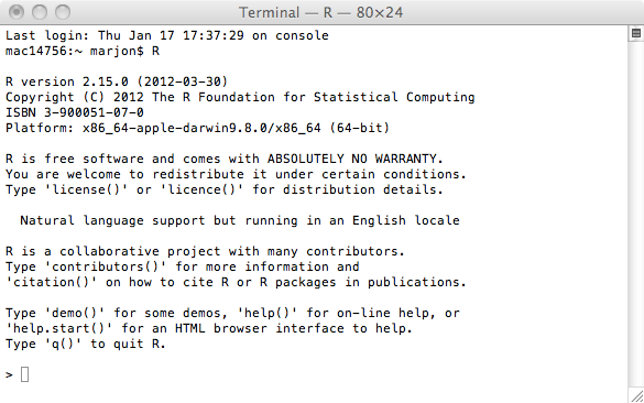 R comes with automated installers for lots of platforms, and installation is pretty easy. If you want a nice graphical interface, I suggest Rstudio. R comes with its own graphical user interface, but I find it annoying. I usually work with R in a terminal window, like this: At the shell of a unix terminal, just write ”R”. A legal disclaimer and a friendly ”>” greets you. You are now interacting with R.