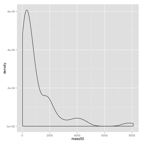 Both the dotplot and the density plot show that the distribution of comb gnome masses at time 50 is skewed to the left, with many individuals with low mass, and a few very heavy ones.
