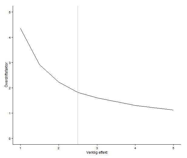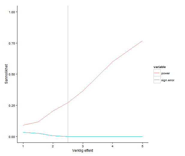 Det här diagrammet visar chansen att få ett signifikant resultat (alltså styrkan) samt risken för teckenfel vid olika verkliga effektstorlekar. Den grå linjen markerar 2.5 enheter. Jämfört med Gelmans & Carlins exempel ser risken för teckenfel inte så farlig ut: den är väldigt nära noll vid realistiska effekter. Styrkan är fortfarande sådär, knappa 30% för en effekt på 2.5 enheter.