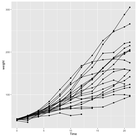 geom_line(aes(x = Time, y = weight, group = Chick), ..., data = df) +