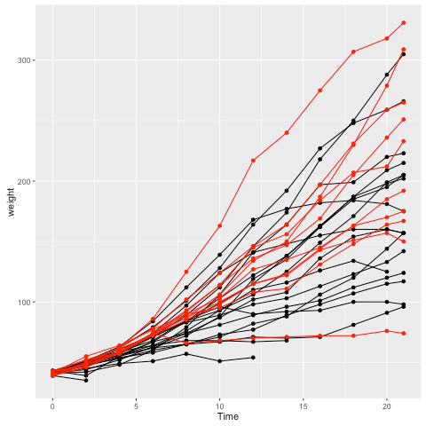 library(ggplot2) data(ChickWeight) diet1 <- subset(ChickWeight, Diet == 1) diet2 <- subset(ChickWeight, Diet == 2)