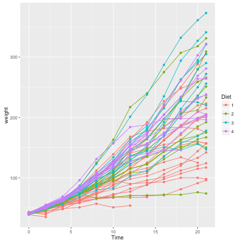 Okay, maybe that plot is a bit too busy to be good. But note how the difference between plotting a single diet and all diets at the same time is just one more mapping in aes(). No looping or custom functions required.