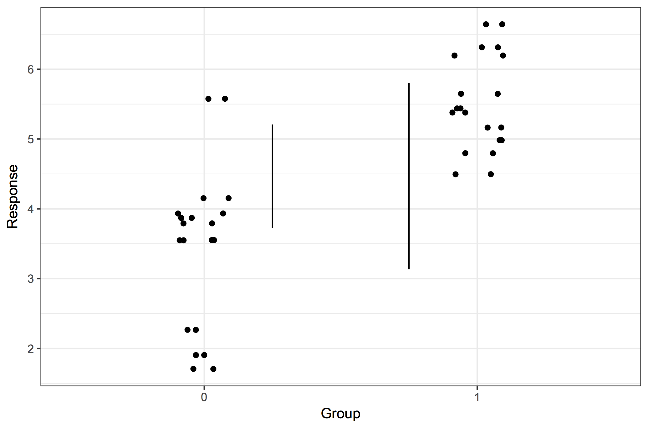 library(broom) library(egg) library(ggplot2) data <- data.frame(group = rep(0:1, 20)) data$response <- 4 + data$group * 2 + rnorm(20)