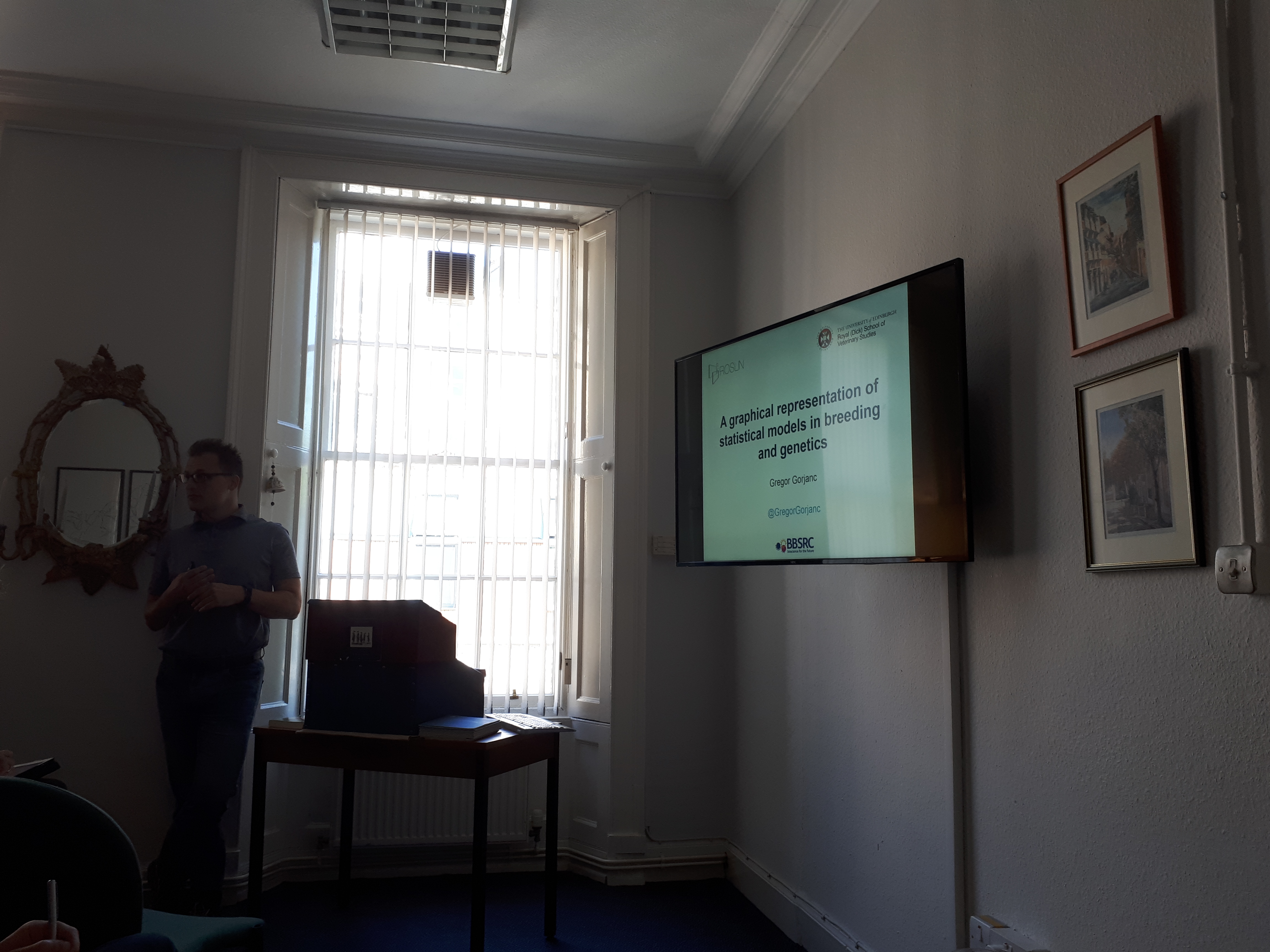 Gregor Gorjanc presented the very essence of quantitative genetics: the pedigree-based model. He illustrated this with graphs (in the sense of edges and vertices) and by predicting his own breeding value for height from trait values, and from his personal genomics results.