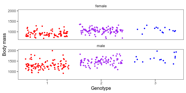 This piece of code builds a combined data frame with informative genotypes and body mass. Then, it makes the above plot for each marker into an animation.