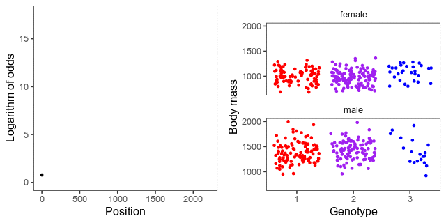 Cullen Roth posted a beautiful animation of quantitative trait locus mapping on Twitter. It is pretty amazing. I wanted to try to make something similar in R with gganimate. It’s not going to be as beautiful as Roth’s animation, but it will use the same main idea of showing both a test statistic along the genome, and the underlying genotypes and trait values. For example, Roth’s animation has an inset scatterplot that appears above the peak after it’s been reached; to do that I think we would have to go a bit lower-level than gganimate and place our plots ourselves.
