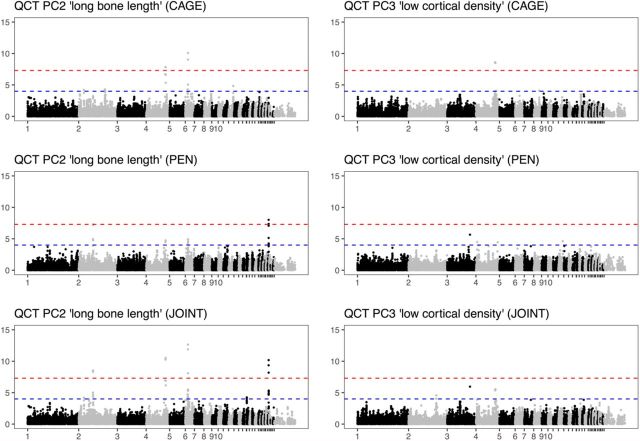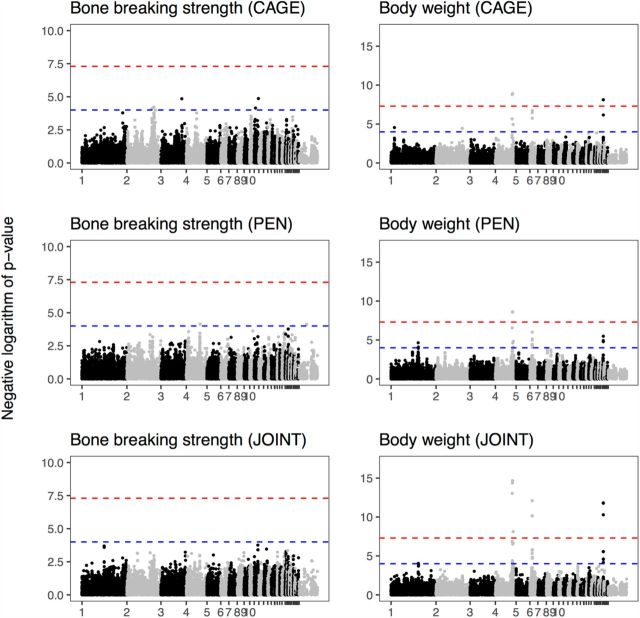 Fig 6 from the paper, showing genome-wide association results for eight of the populations (one had too few individuals with recombination rate estimates after filtering for GWAS). The x-axis is position in the genome, and the y-axis is the negative logarithm of the p-value from a linear mixed model with repeated measures.