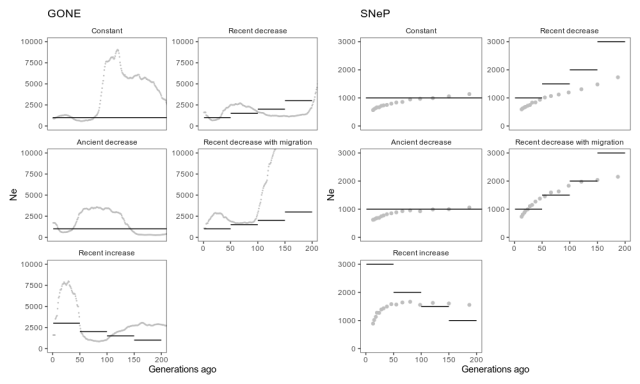 Estimates from GONE, with default settings, and SNeP, with reasonable setting used in the SNeP paper, applied to simulated data from different scenarios. Grey dots are estimates, and black lines the true simulated population history. The estimates go on for a while, but as per the GONE paper’s recommendations, we should not pay attention to estimates further back in time where these methods are not accurate. That is, we should probably concentrate on the first 100 generations or so.