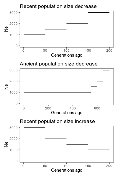 We simulate a constant population, a population that decreased in size relatively recently, a population that increased in size recently, and a population that decreased in longer ago. The latter should be outside of what these methods can comfortably estimate. Finally, let’s also include a population that has migration from an other (unseen) population. Again, that should be a case these methods struggle with.