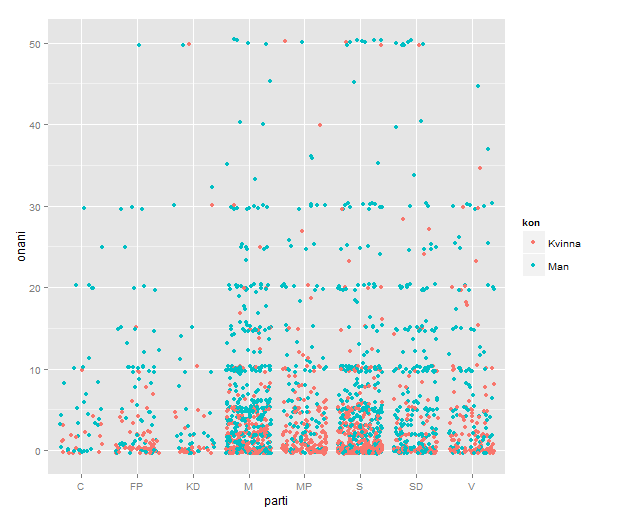 På den horisontala axeln ser vi alltså vilket parti de svarade och på den vertikala antalet gånger de haft sex de senaste 30 dagarna. (Någon undrade hur det kommer sig att punkter kan hamna strax under noll? För att alla punkter inte ska hamna ovanpå varandra har vi lagt på ett lite slumpvis brus.) Allra längst upp vid femtio (fler än femtio var det största alternativet) finns två punkter: två deltagare i undersökningen som svarat att de haft sex fler än femtio gånger senaste månaden och skulle rösta på KD. Dessa två extrempunkter drar upp medelvärdet för KD-gruppen, som är jämförelsevis liten och får den att verka extremare än den egentligen är. Så — första sensmoralen: Rita diagram och se efter om de numeriska resultaten verkar rimliga!