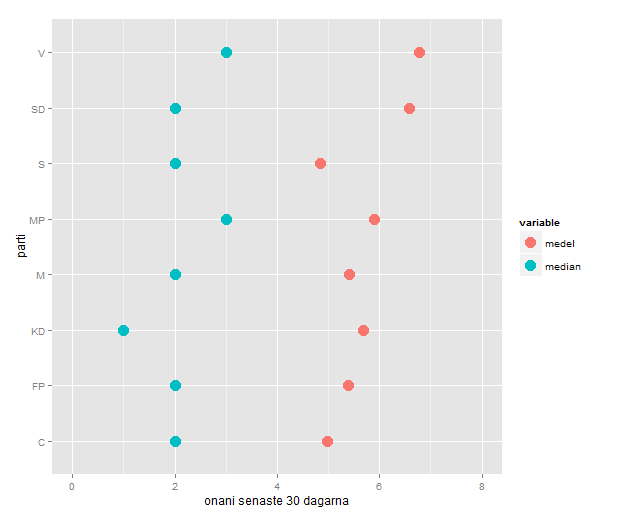 Så, medelvärdet (den röda pricken) är hela tiden högre än medianen (den turkosa) — det tyder på att fördelningen är sned och att de flesta observationerna har låga värden. Inget nytt. Om vi tittar på medianerna verkar inte V och SD lika extrema. SD får median på två gånger per månad, precis som nästan alla partier. V och MP har medianen tre. Inte ens om vi tar medelvärdena för vad de är så blir det någon vidare imponerande skillnad. Medelvärdet för onani bland de som kryssat V och SD är ungefär sju. Medelvärdet för M är ungefär 5.5. Att onanera en och en halv gång mer eller mindre i månaden, är det en skillnad att twittra om? Andra sensmoralen: Titta på siffrorna och fundera på om skillnaden är stor (eller liten) nog för att vara meningsfull.